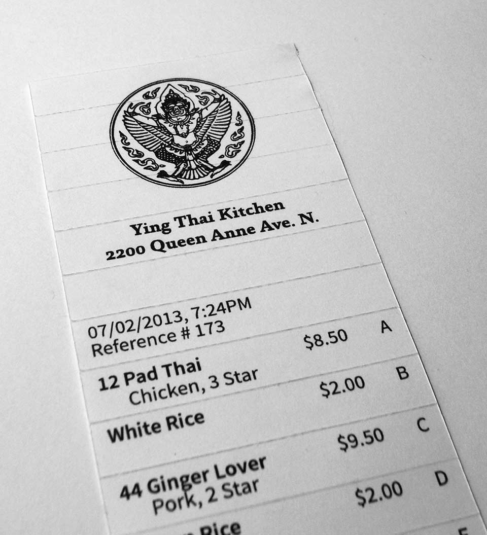 To remain as simple and familiar as possible, visual design complications have been kept to a minimum. Type hierarchy adds emphasis to important information and unnecessary information has been removed. The restaurant is given visual branding with a logo, yet the overall feel falls in line with traditional receipts.